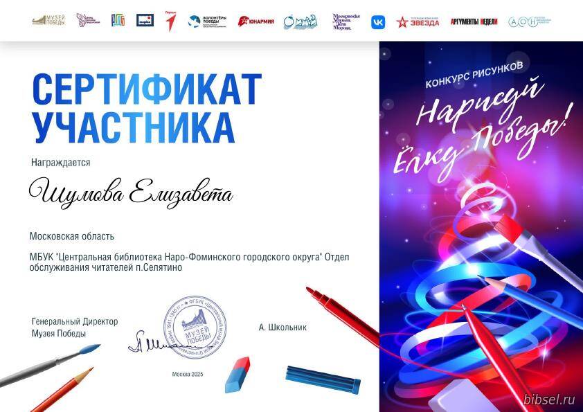 На конкурс было прислано более 57 тысяч работ. От отдела обслуживания читателей п. Селятино участие в конкурсе приняла Шумова Елизавета. Её работа «Ёлка Победы» была отобрана для представления на сайте Музея Победы.