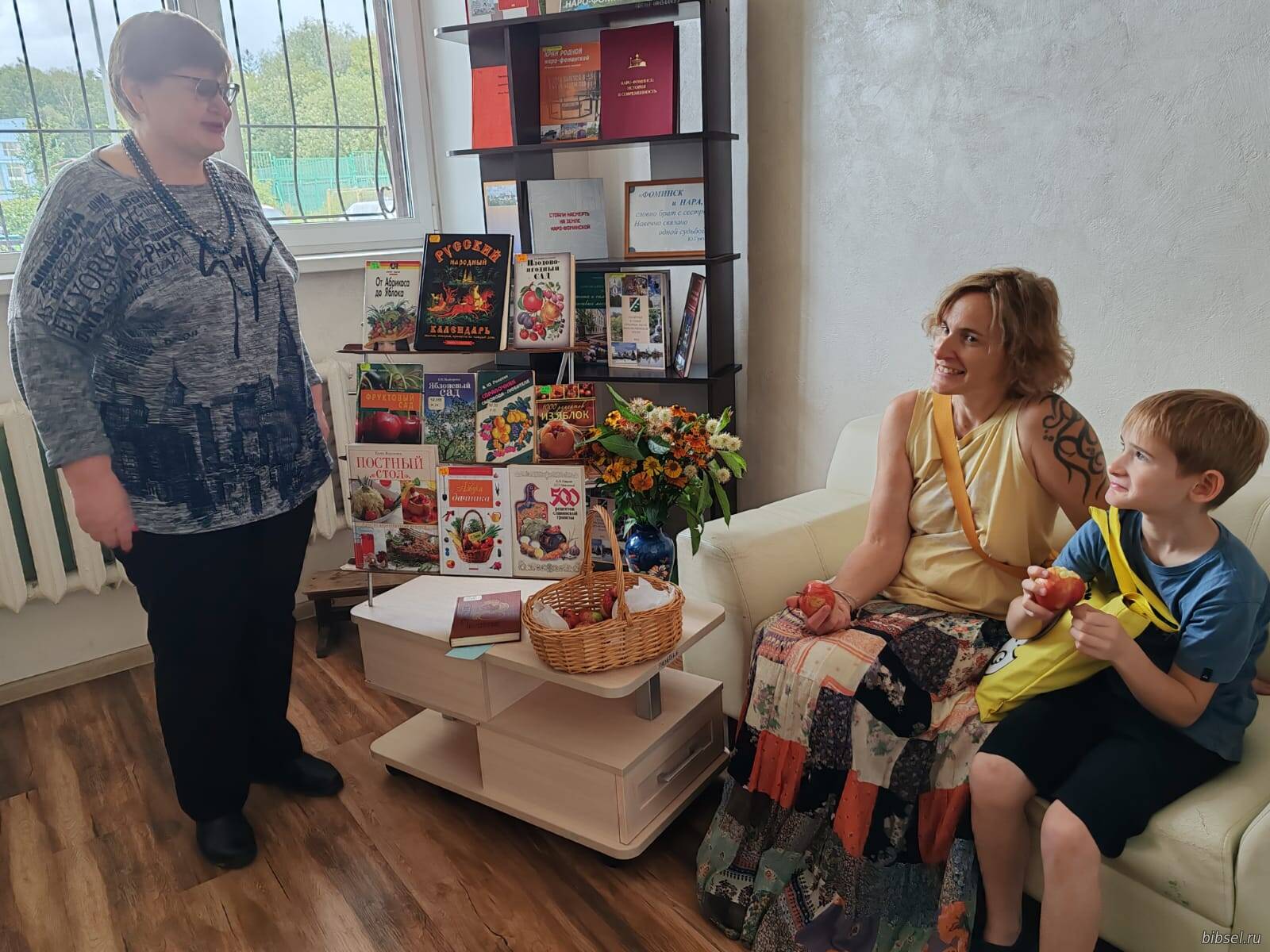 К Яблочному Спасу библиотекари отдела обслуживания читателей провели цикл мероприятий. Была организована книжно-иллюстративная выставка. На ней были представлены книги об использовании яблок. Это и церковные обряды, и в сказках, и яблоневые сады, и в искусстве, а уж заготовок из яблок – полно! В качестве иллюстрации-угощения служили ароматнейшие яблоки из собственного сада и цветы августа.